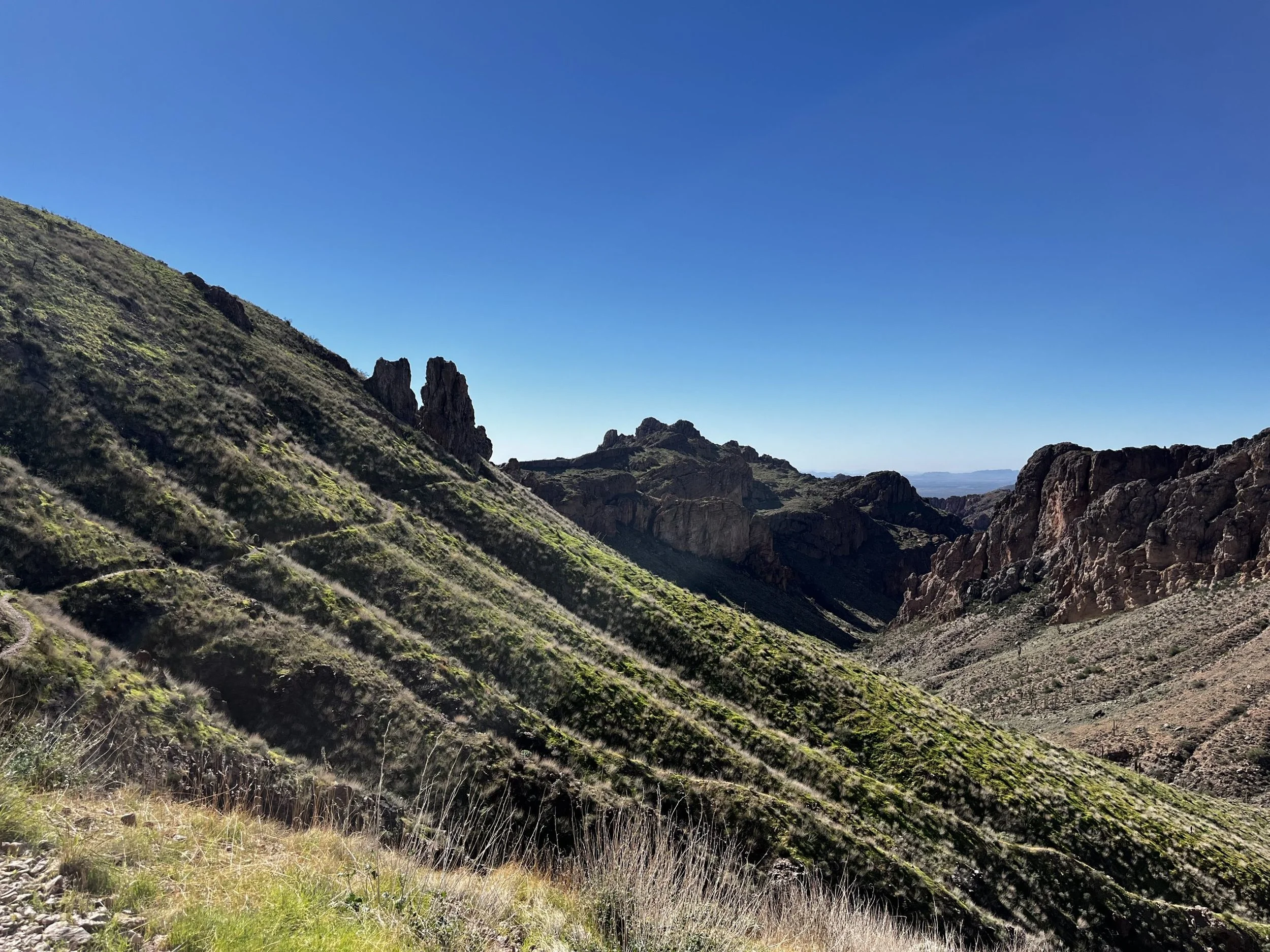 The section between Superior and Kearny is majestical. We took a slight alternate route out of Superior through Telegraph Canyon, because we like shortcuts. For those who use FarOut — see the picture below with the green line. Telegraph Canyon is that green bit that doesn’t follow the blue or brown lines. It started nicely, but about half a mile in it turned into flood-damaged chaos, so it took some scrambling and climbing through branches to get through this “shortcut.” Not sure if I’d recommend it.