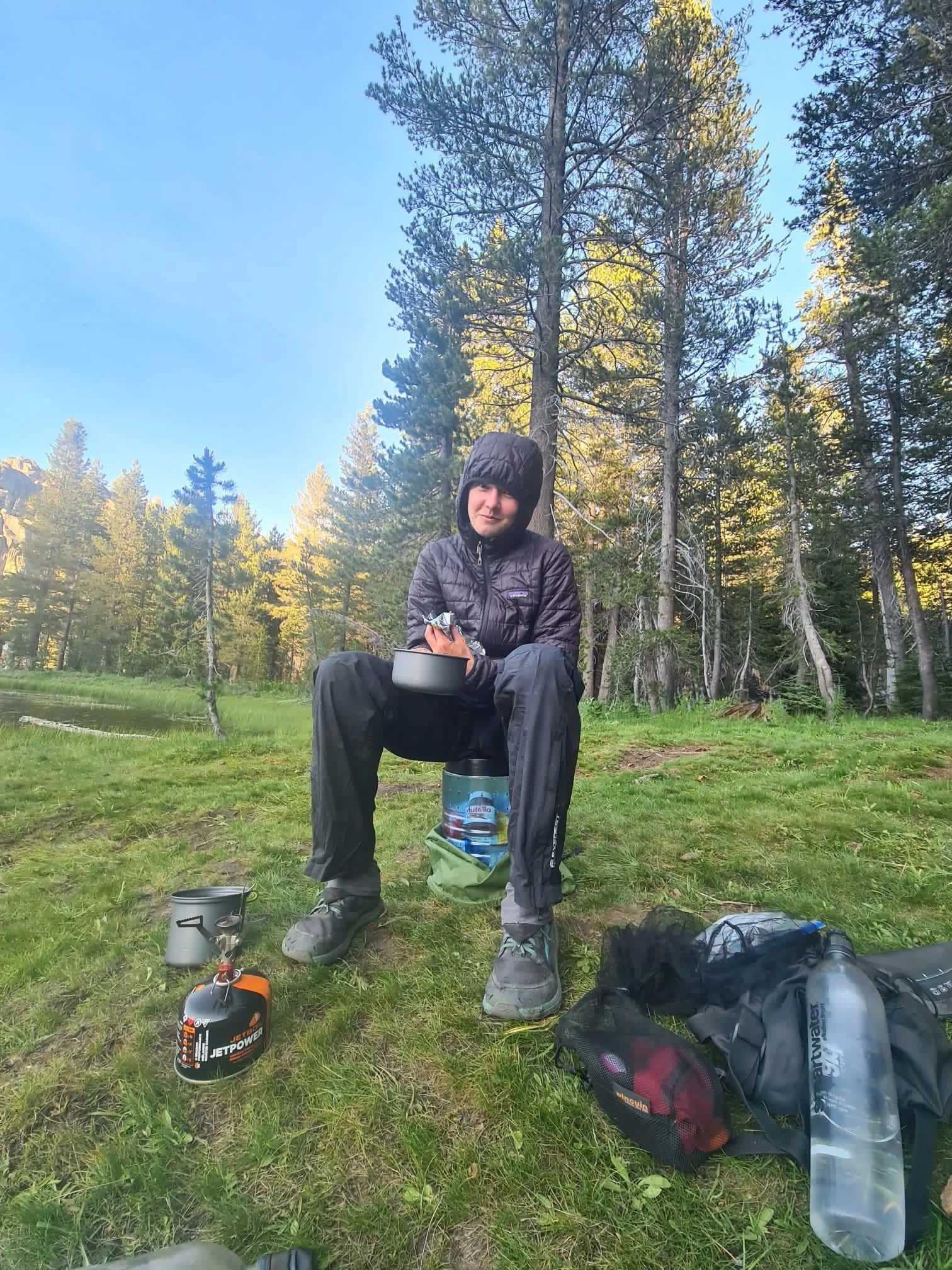 We weren’t going to panic, but ok ok, I’m getting out of the water…by the time I hesitantly put my socks on (cause I can’t even see the smoke yet, why the rush), more people, who have turned around, came over, a helicopter flew over our heads and a ranger appeared on trail right beside us, so mysteriously, you could think he was dropped out of the heli, and the best thing was that the dude had a walkie broadcasting helicopter chat. He said they hoped to contain the fire by the evening, so we scrambled onto rocks higher up to watch the action. After about an hour of me eating trail mix like pop corn, watching a helicopter flying back and forth, dumping water on trees, the smoke seemed to have almost ceased, so I got down to finish my previously interrupted bathtime in the waterfall, cooked some dinner, talked to the ranger, who was still there, listening to heli chat, and the wildfire was put out. Thankfully this time we did not have to turn around and walk back. Lesson I’ve learned a while ago- if you have to make a fast decision, wait 10 min, and if you still have to make it- do it faster than you would have done it 10 min ago. 9 times out of 10, the problem would turn out not to be a problem at all. You’d waste more time undoing decisions that were done too fast.