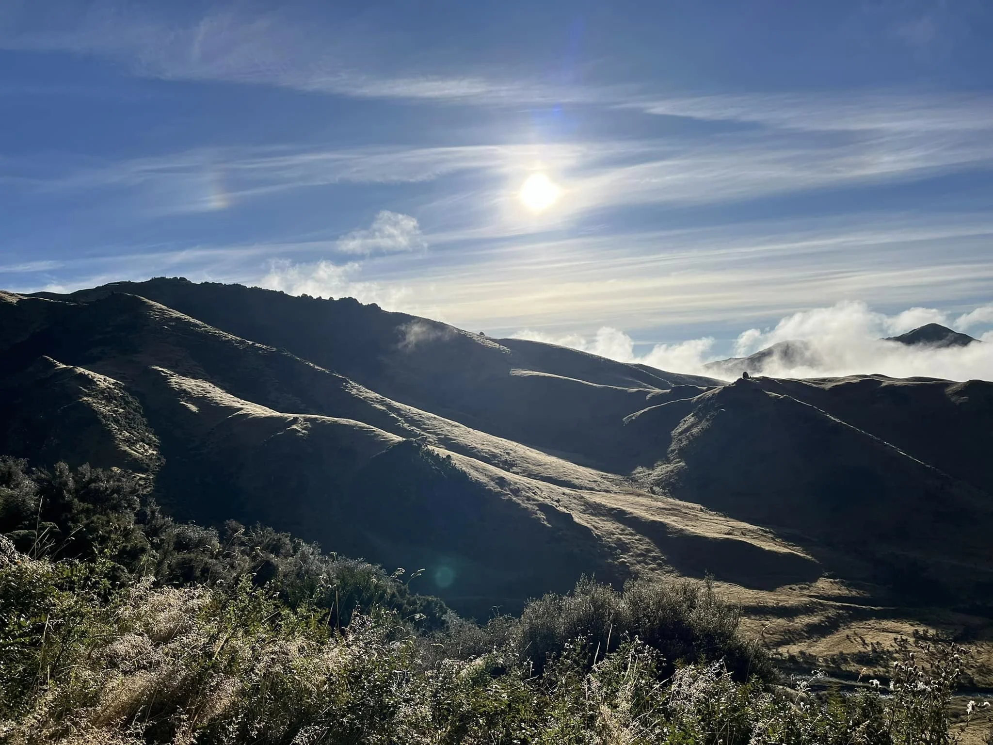 Look at that moss on tree trunks, at just how many mushrooms are around in the beech woods, at those cute robins eating sandflies, at the fog, the tussock and the fern!