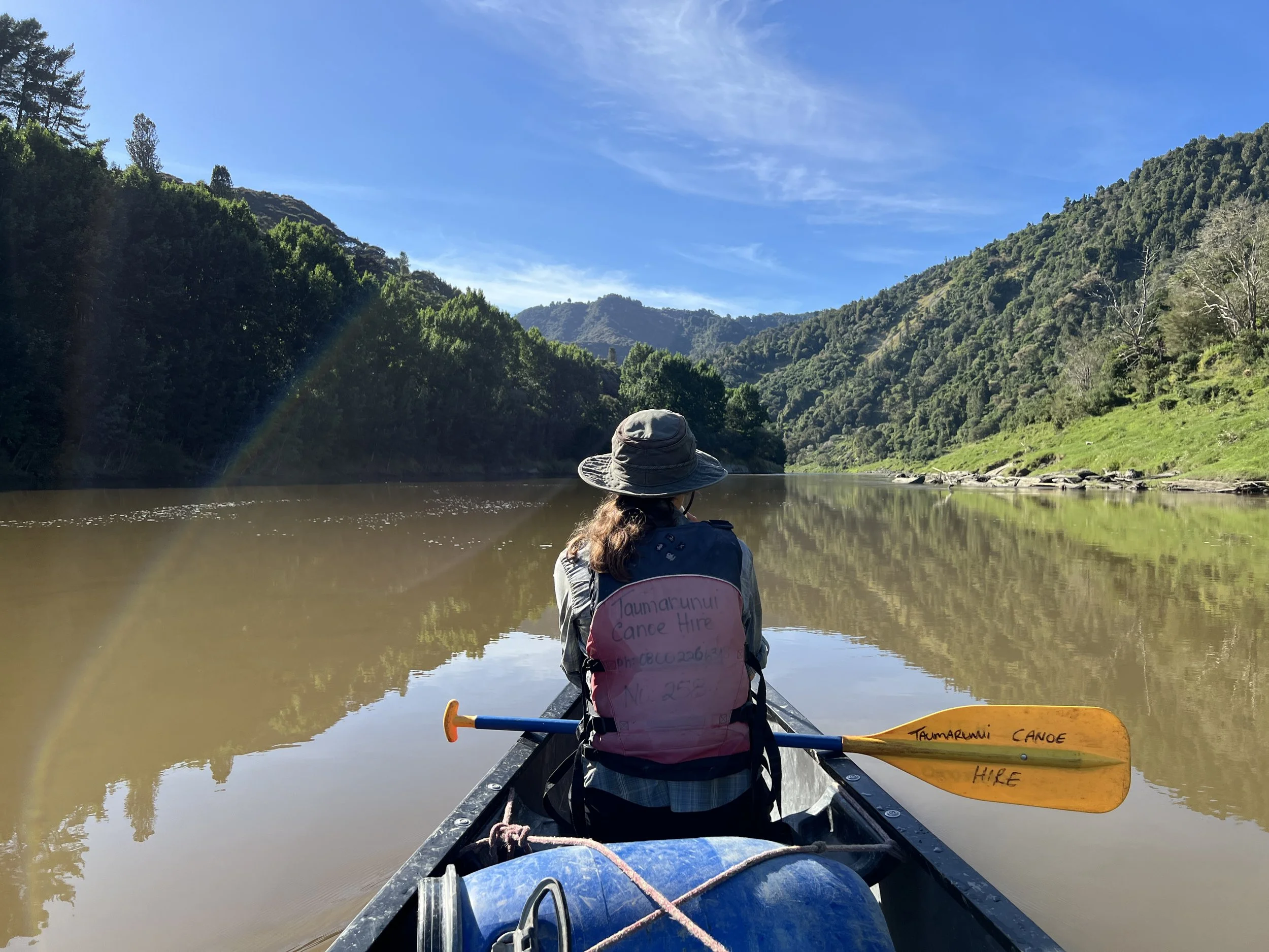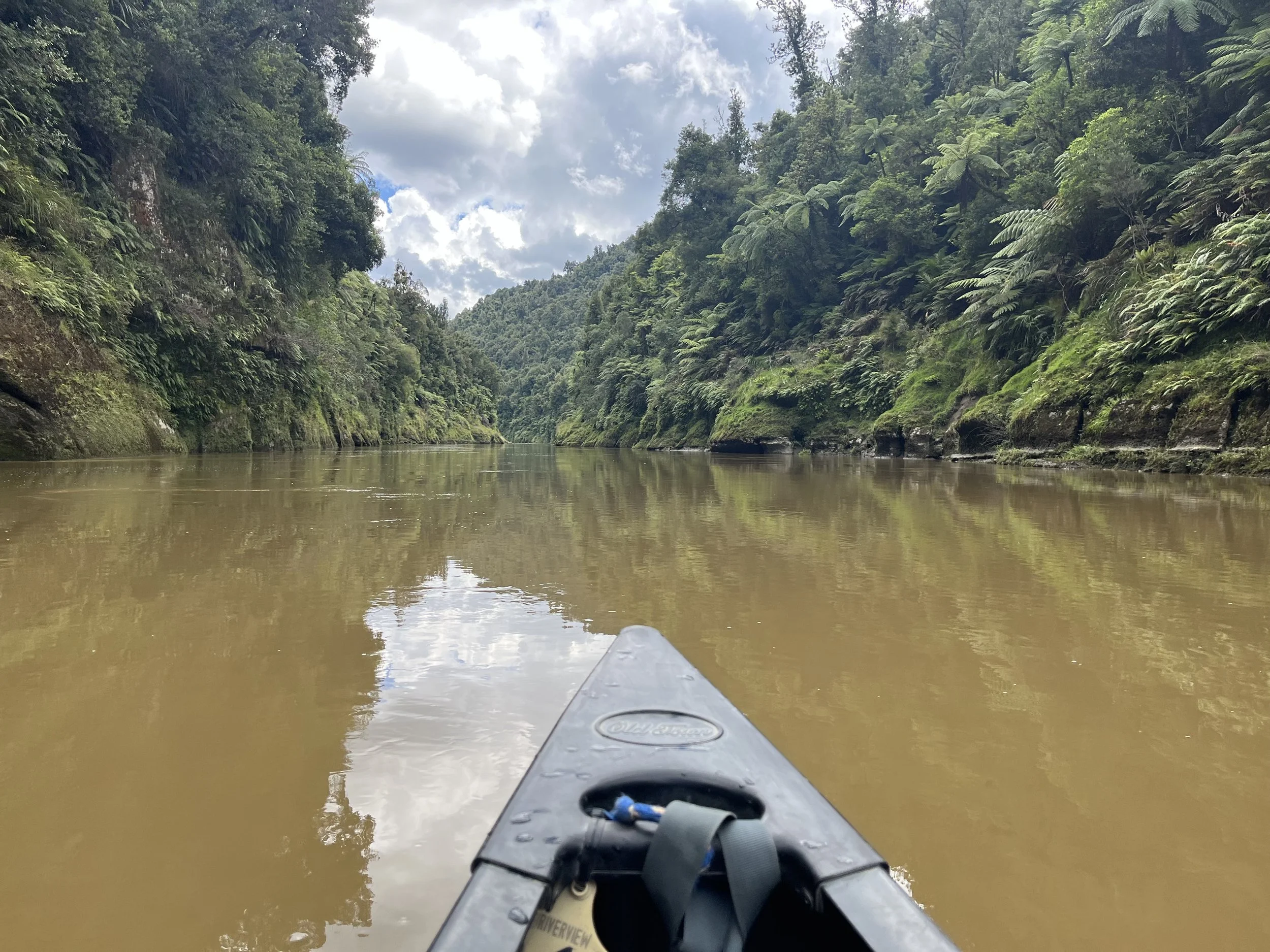 Whanganui river canoe trip was one of those. It rained shortly before and it looked like was going to rain more on January 16th, the day before our planned departure, so Taumarunui Canoe Hire kept sending us messages that the trip could potentially be cancelled. It wasn’t, but the river looked like a flooded latte. I actually quite liked that color. It contrasted well with the rainforest around it and looked “wilder”. The downside (or maybe the upside?) to it was that due to water levels being a bit higher, it wasn’t actually wilder, instead, it smoothed out the currents and they weren’t as strong. We’ve watched a whole video on the treacherous turns we had to remember and how to successfully navigate white waters. There was even this famous 50/50 place named supposedly because only 50% of canoers manage to get through it without toppling over. We kept anticipating it, but somehow didn’t even notice it. There were a couple of fun places with waves coming from all directions, and sometimes the nose of the canoe would splash wildly into the water, sending a wave of cold river water directly on me, but overall the river was pretty smooth to the point it got rather boring towards lunchtime of the second day.