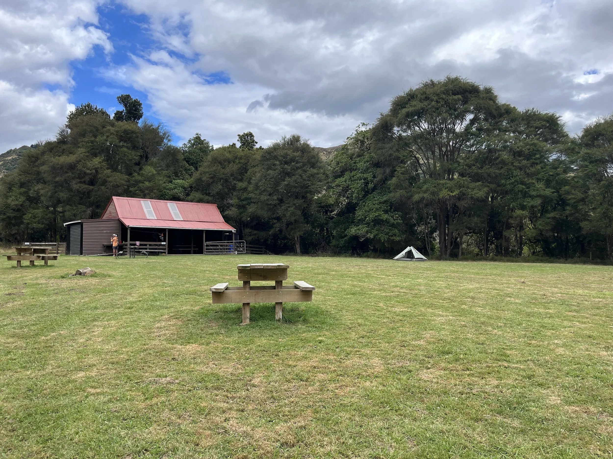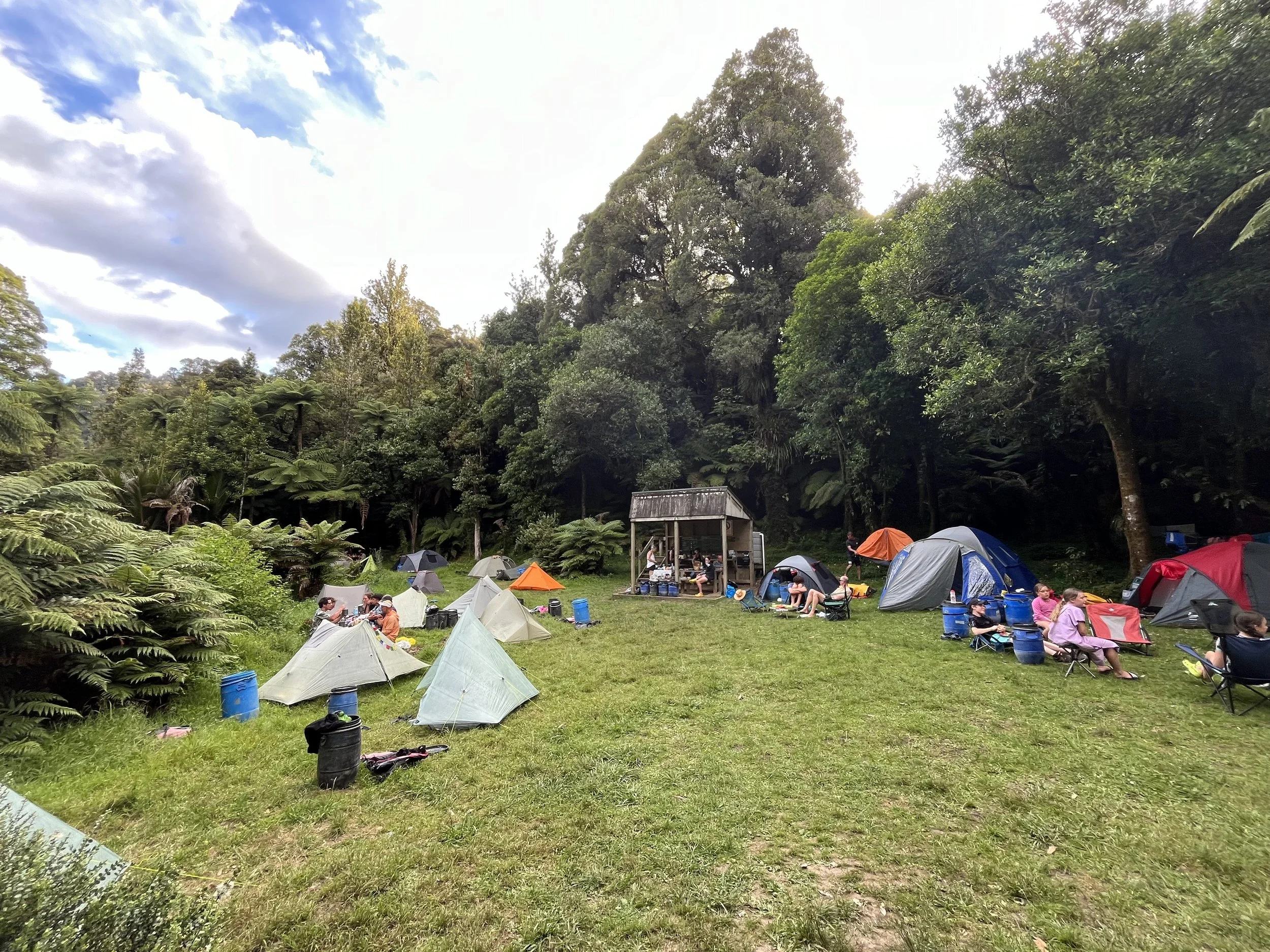 First campsite we were booked into was Mangawaiiti. We pull in, almost fall into the river when exiting the boat (the banks are hilly and pure, slippery mud) and realize we have to heave our barrels up a hill to the campsite. Each of us has two of those, weighing about 15 kg (I guess?). It’s a short hill, but steep, so you huff and puff, and laugh at yourself shopping for heavy things, because “you won’t be carrying it on your back”. One by one, the 17 of us park the canoe and reach the hilltop where we find a big family (or a group of them) with castle-sized tents taking up almost every flat spot, having claimed the remaining free space with their camping chairs, happily sitting in a half-circle, their kids playing ball, unconcerned about a bunch of hikers trying to set up their tiny tents on the grassy, slanted spots around the castle city. Eventually, when all of us were set up, more people we don’t know started showing up and the family were forced to squeeze a little and cede some of their territory to accommodate the new arrivals.