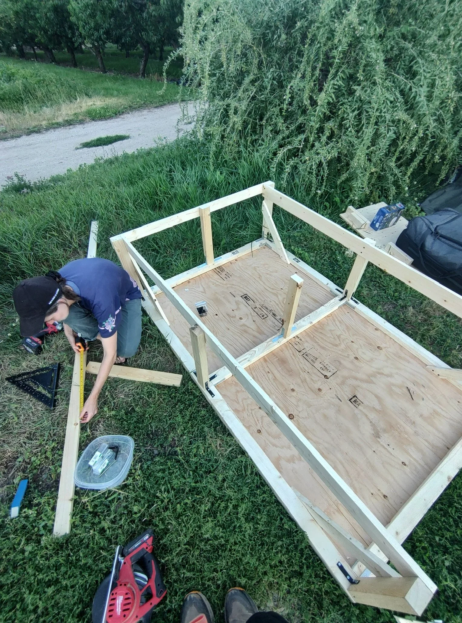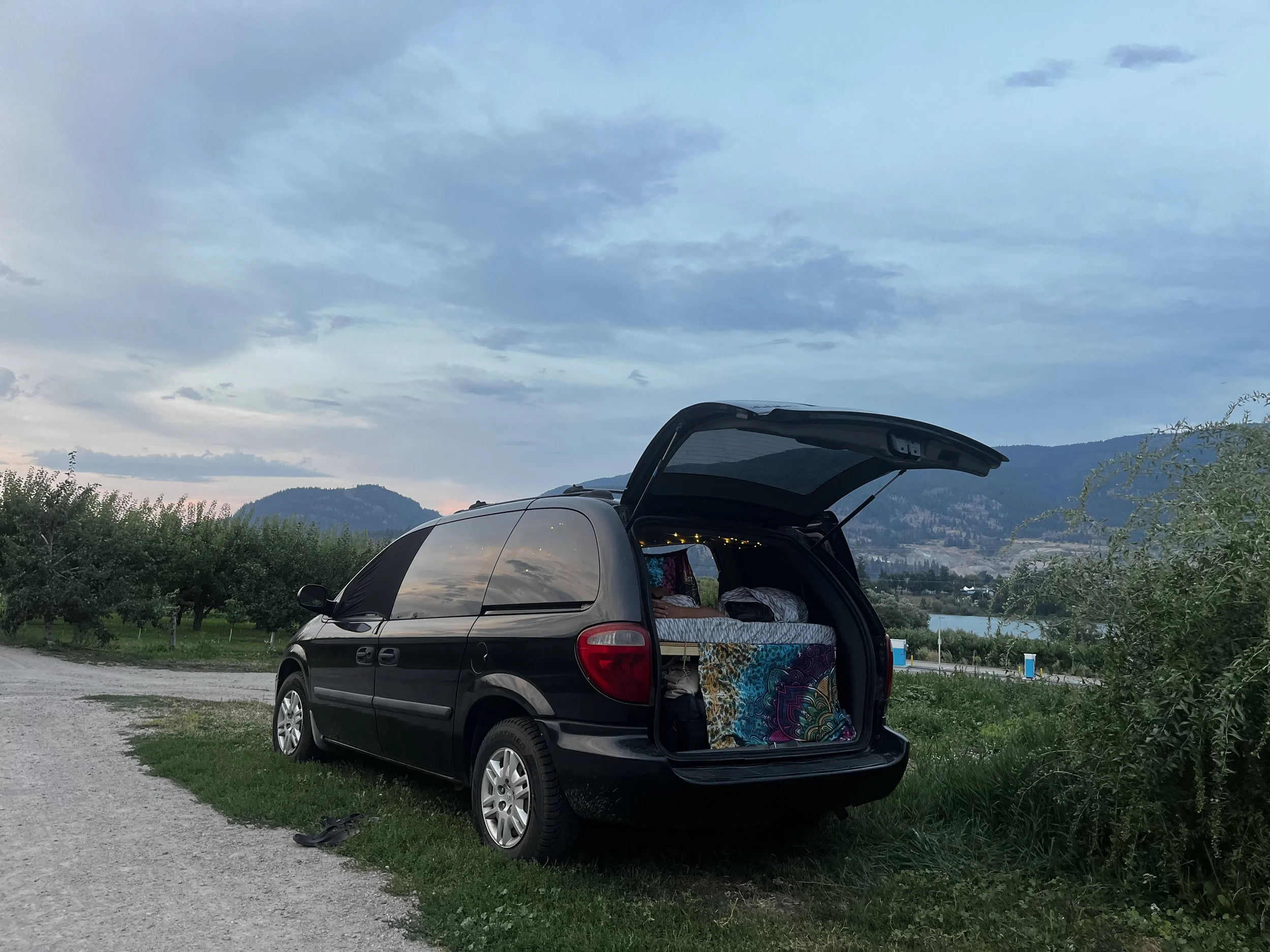 In the meantime, we’ve built a bed in the car we bought. Yep — we now own a Dodge Caravan. It has no bed bugs. It did have wasps living in the door, but Kez destroyed their nest. The poor, confused wasps hung around the door for about a day, then gave up.