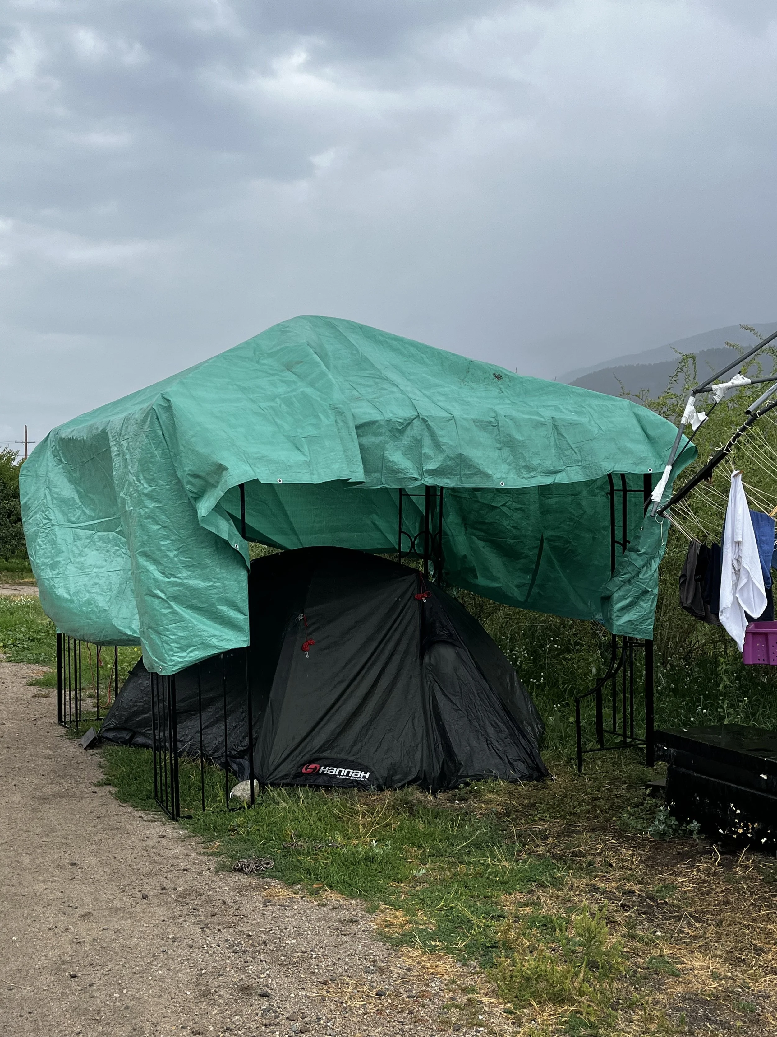 Then it rained, and I discovered my centuries-old tent wasn’t waterproof (I kinda suspected that — the thing is almost as old as me). So we put a big gazebo over it. But the gazebo had a hole in its fabric roof, so we threw a plastic tarp over the gazebo.